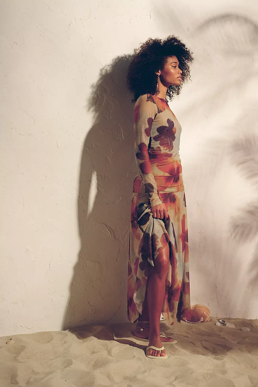 An effortlessly edgy design that transitions seamlessly from day to night, this versatile maxi dress boasts a forever-flattering fit-and-flare silhouette, ruched detailing for added waist definition, and a too-cool mesh fabrication.