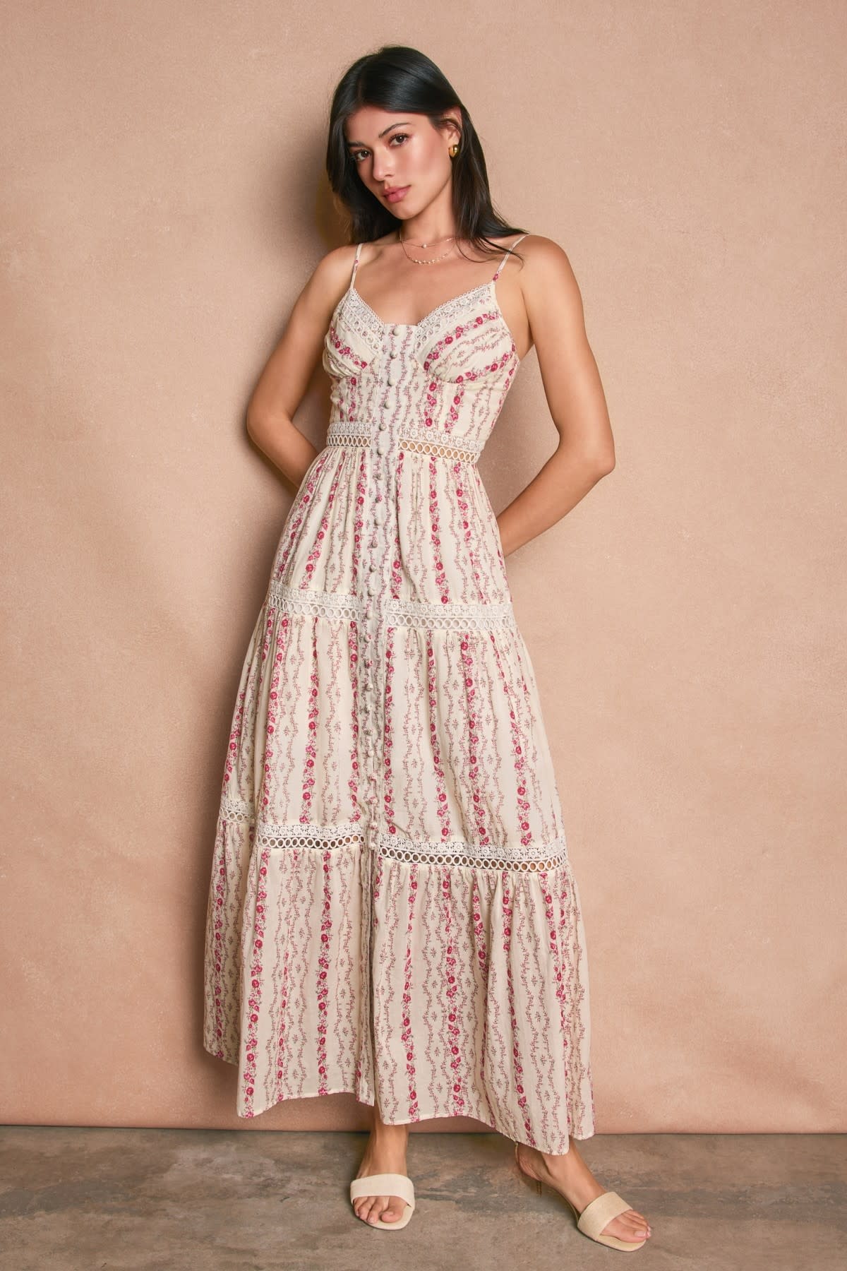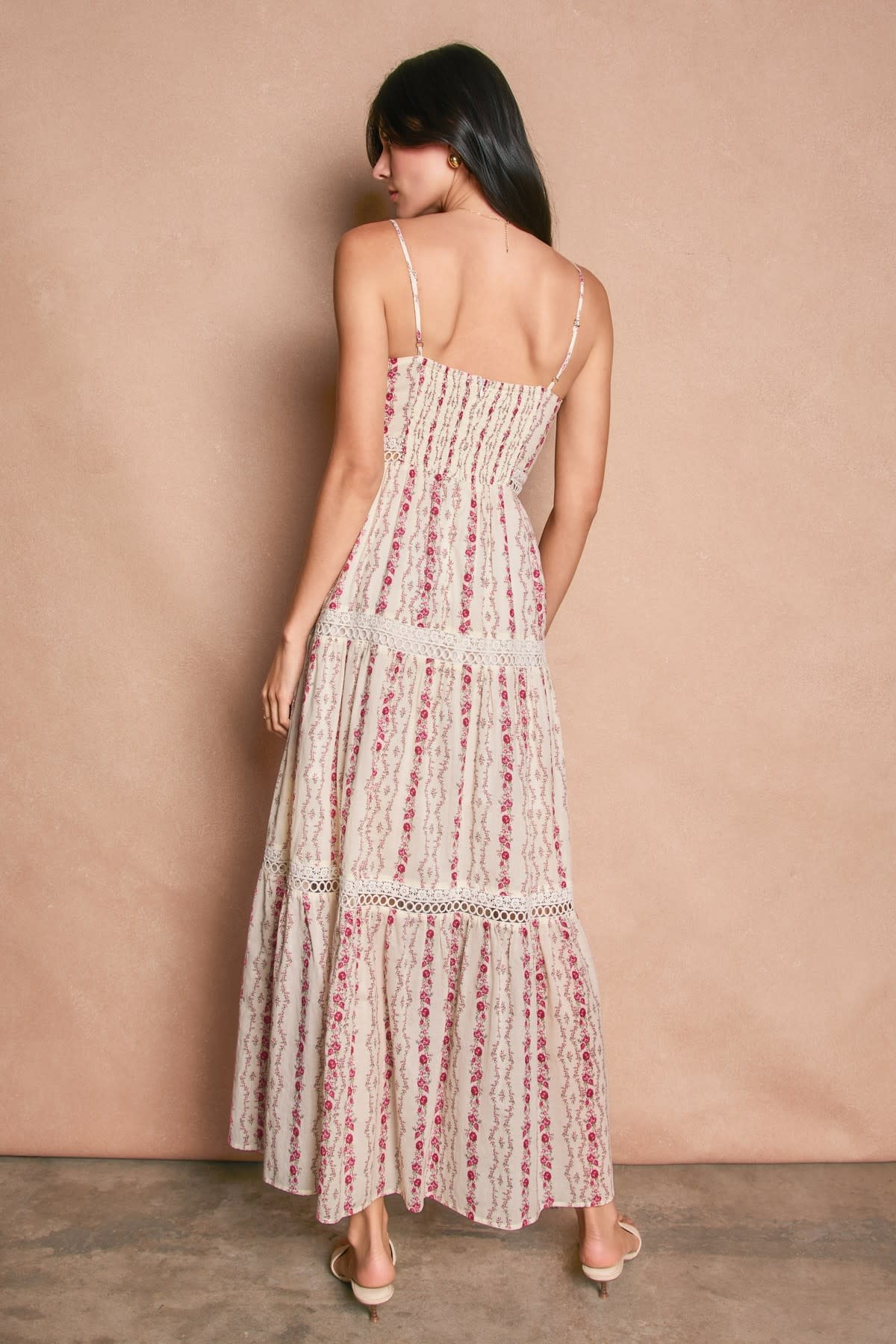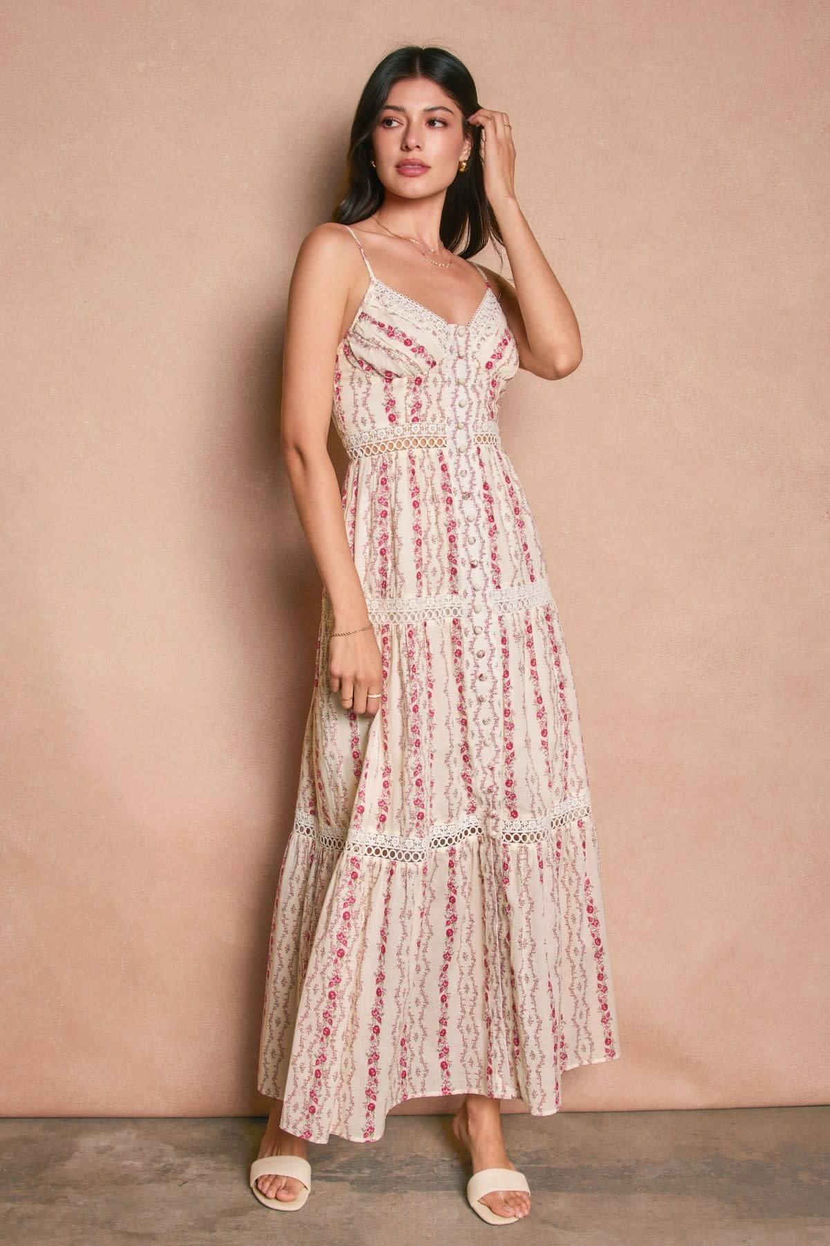 Floral stripe print maxi dress featuring lace details. Model is 5'8" and wearing size Small.
