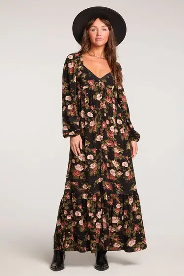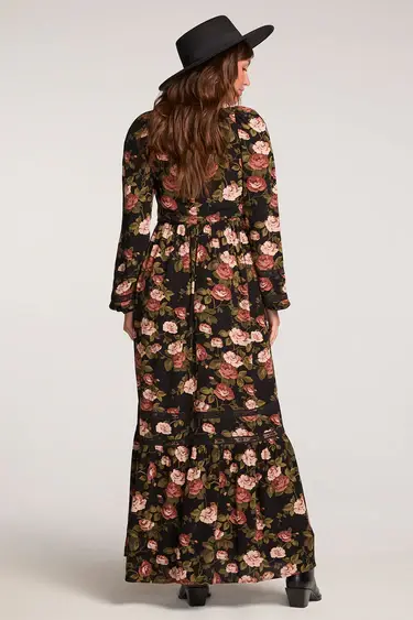 The tiered full skirt adds a playful, flirtatious touch while flowing gracefully with every movement. Presented in a bold botanical print, this dress effortlessly flatters your silhouette, making it perfect for occasions where you want to make a confident, stylish impression.