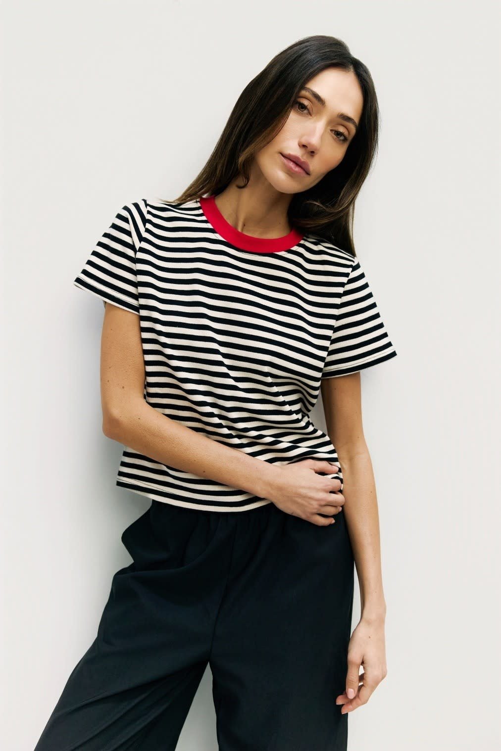The Cooper Top is a relaxed-fit stripe tee with a crew neckline and short sleeves. Finished with a contrast ribbed band, it's a casual and comfortable staple for any wardrobe.