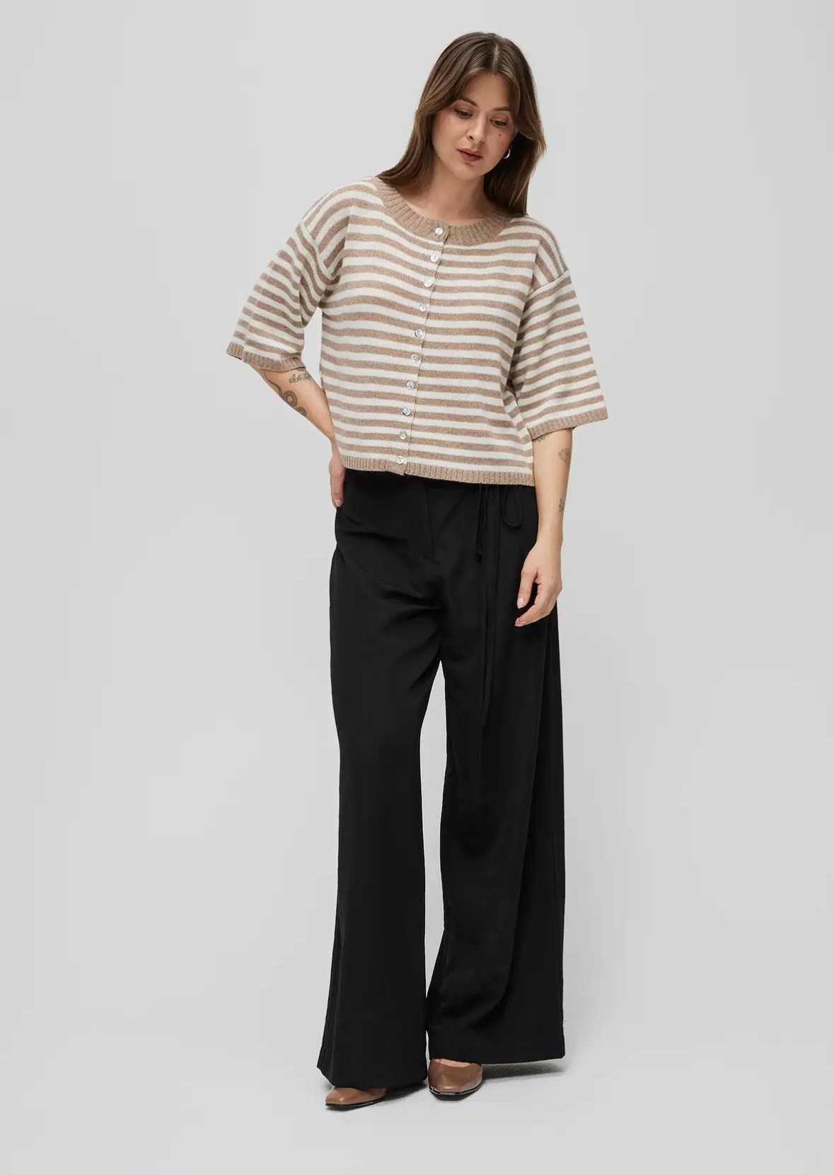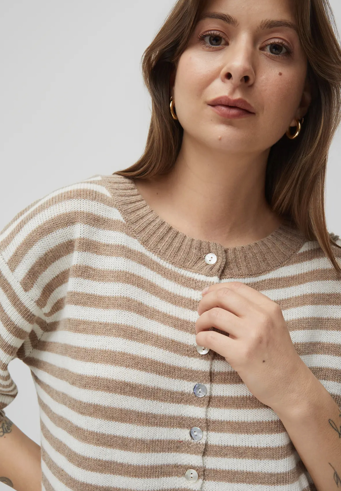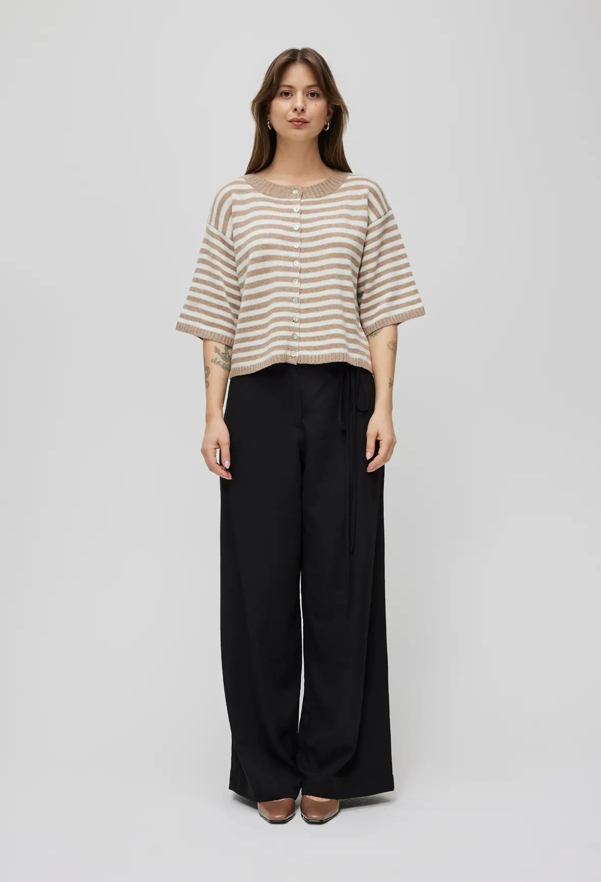 This striped knit cardigan is the perfect blend of comfort and style. Featuring a neutral two-tone stripe, it’s designed with a relaxed, slightly cropped fit, short sleeves, and a classic button-front closure for easy layering or standalone wear.