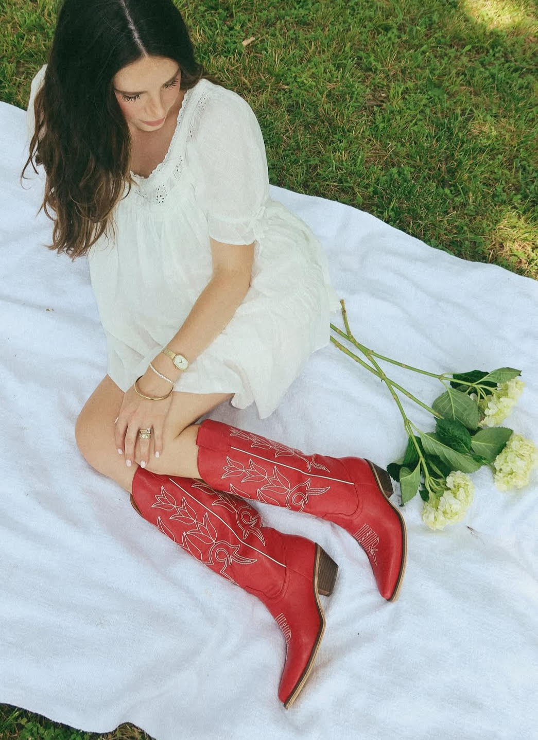 Introducing The SCARLETT - our stunning red cowboy boots with intricate white tulip stitching adds a touch of southern charm. With comfort in mind, the interior is lined with a soft and breathable fabric, providing a comfortable fit that's perfect for all-day wear.