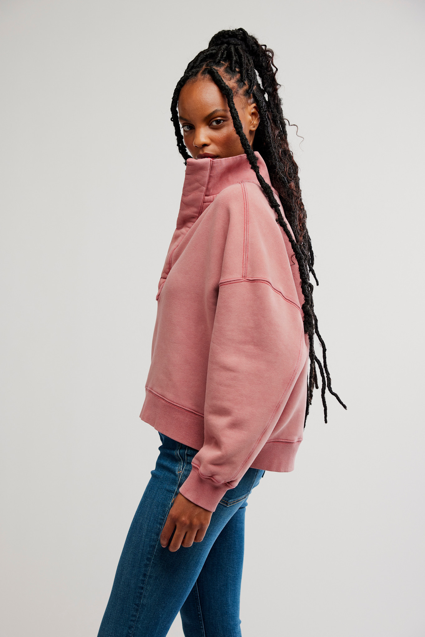 This wear-everywhere pullover features a funnel neck design with quarter-button detail and ribbed trimming for added dimension.
