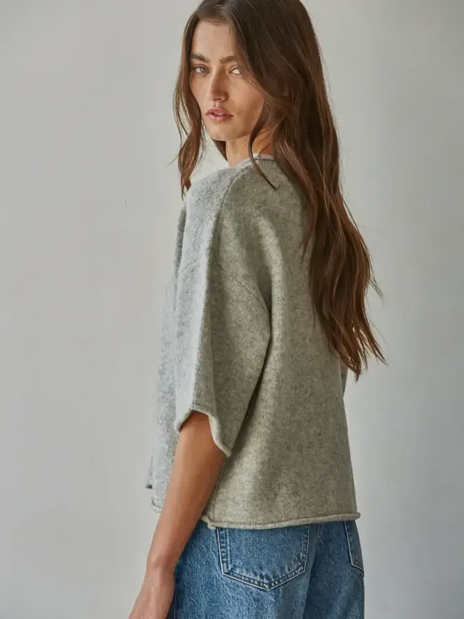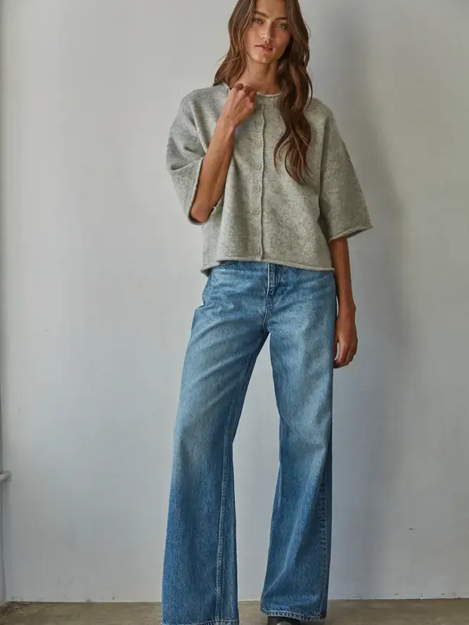 This soft, textured knit top features a relaxed, boxy fit with subtle structure, giving it that “thrown-on but styled” feel. The button-front detail adds just enough interest, while the elbow-length sleeves keep it modern and easy to wear through every season.