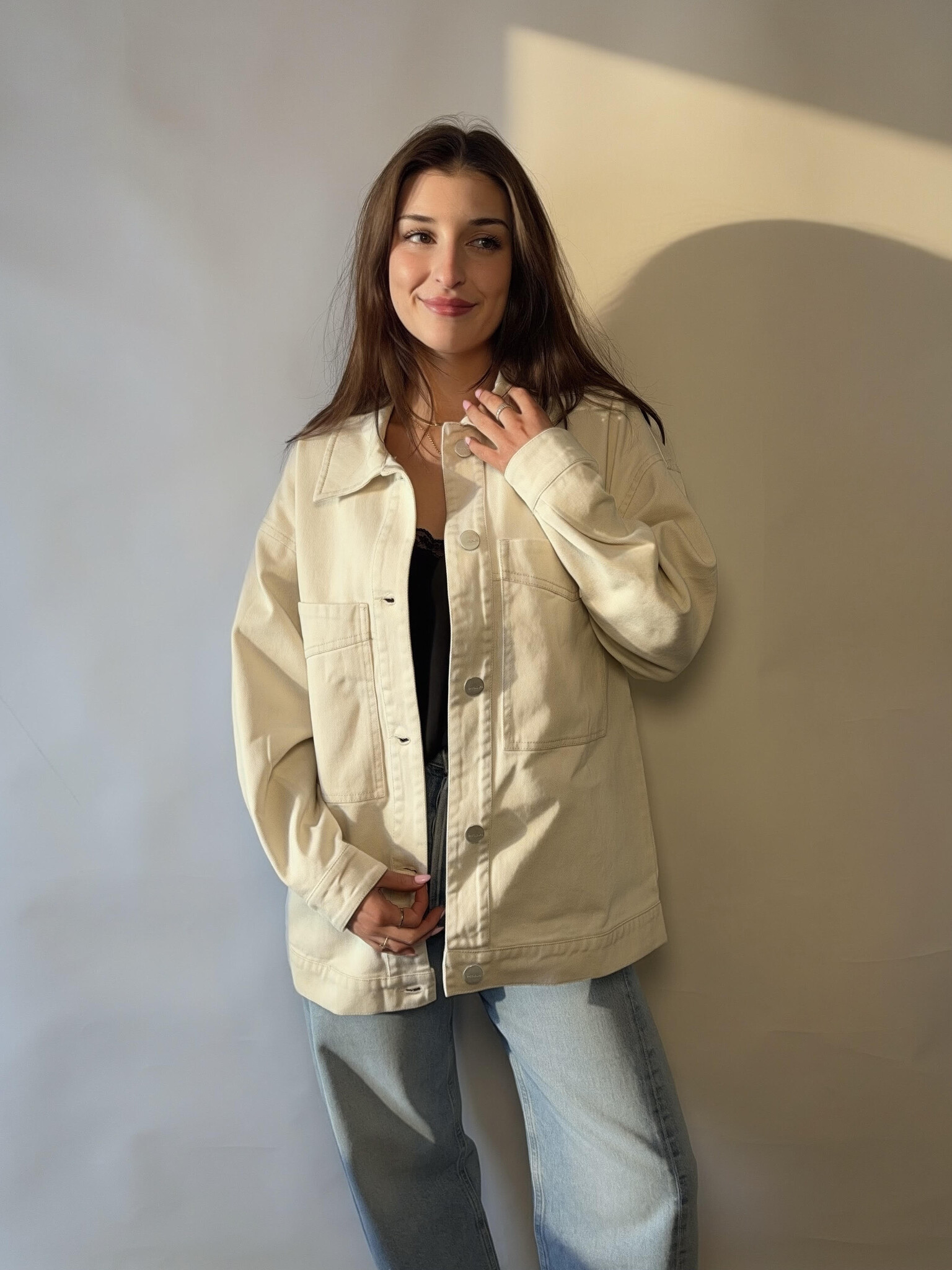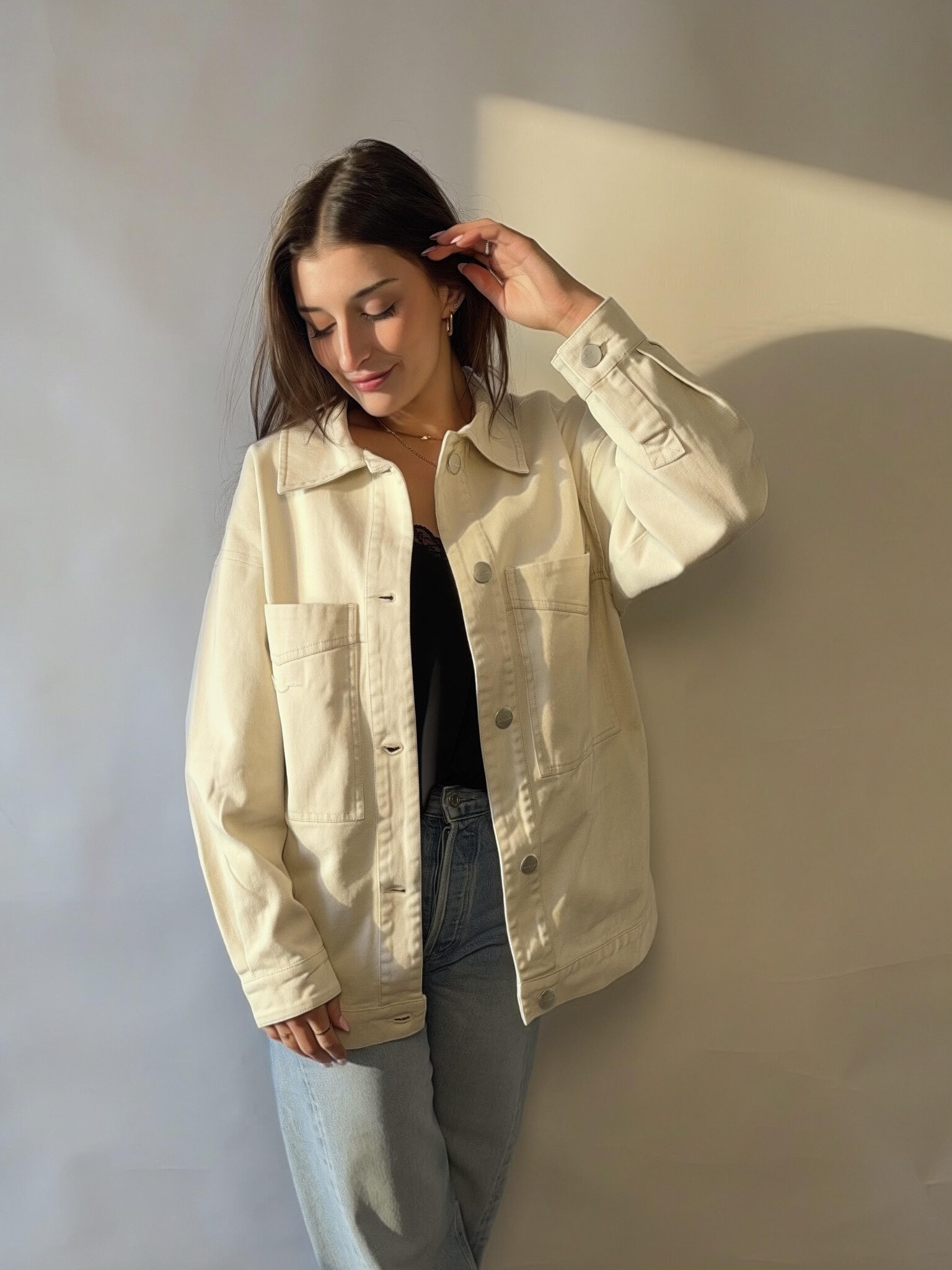This oversized button-front jacket features a structured silhouette with a soft, lived-in touch. Perfect for throwing on over any outfit for an elevated everyday look.