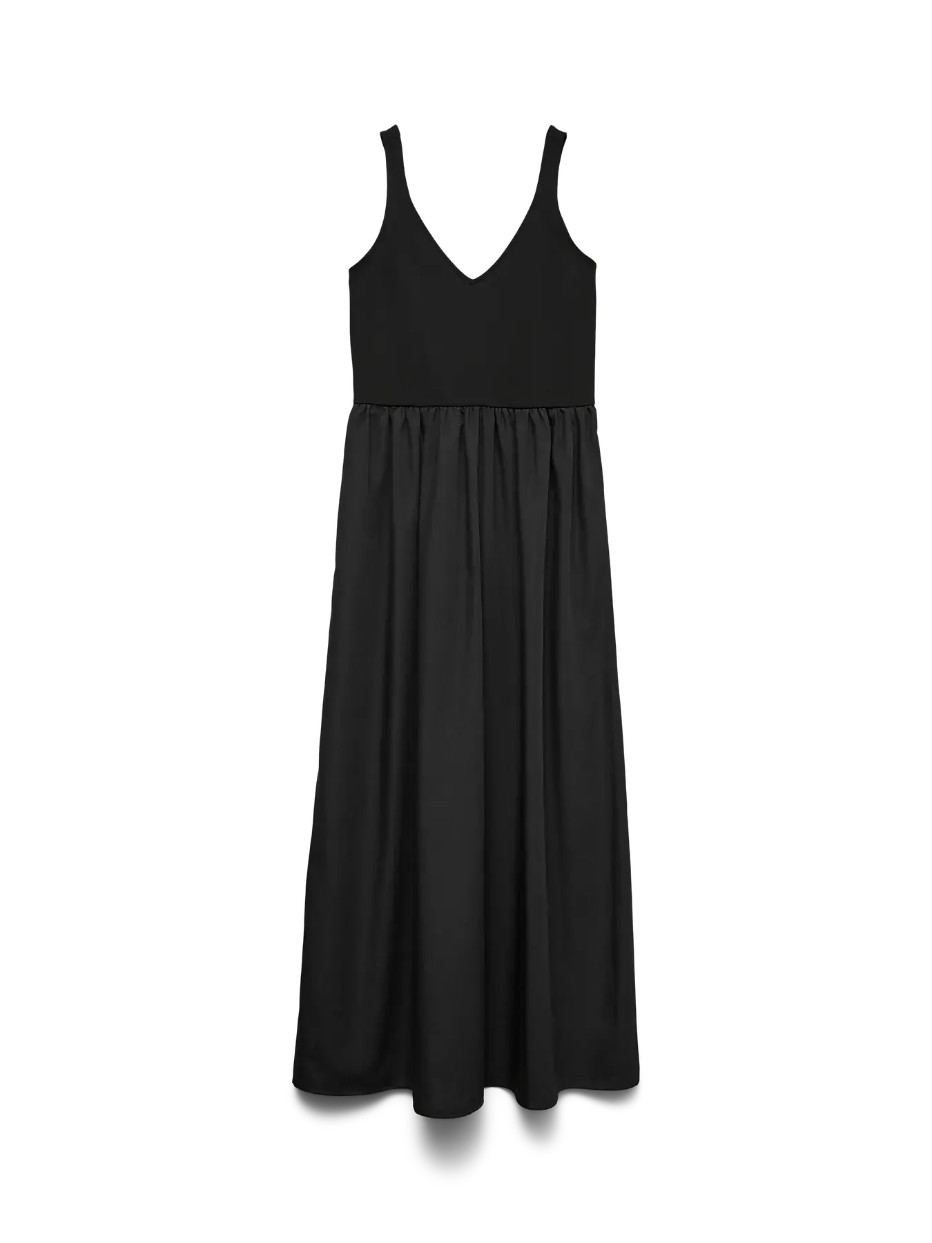 This black maxi dress is your go-to for any occasion. Designed with a flattering sleeveless silhouette and a soft V-neckline, it features a fitted bodice that flows into a full, airy skirt for a beautifully feminine shape. Dress it up with heels or keep it casual with flats—this versatile piece does it all.