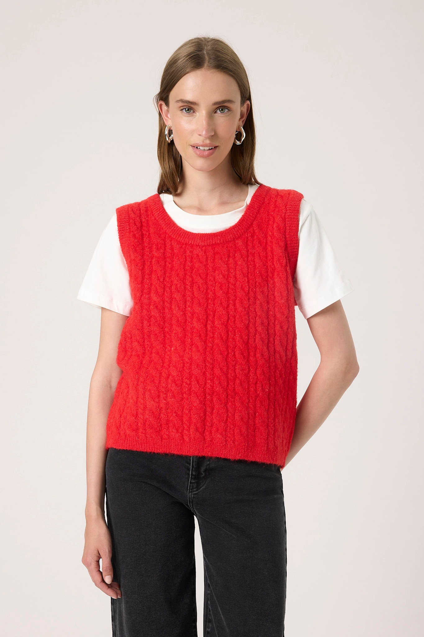 Designed in a vibrant red hue, it brings a modern twist to a timeless silhouette. The soft textured knit offers comfort and warmth, while the sleeveless design makes it perfect for layering over shirts, turtlenecks, or dresses. Its relaxed fit adds effortless style to any outfit. From casual jeans to tailored skirts.
