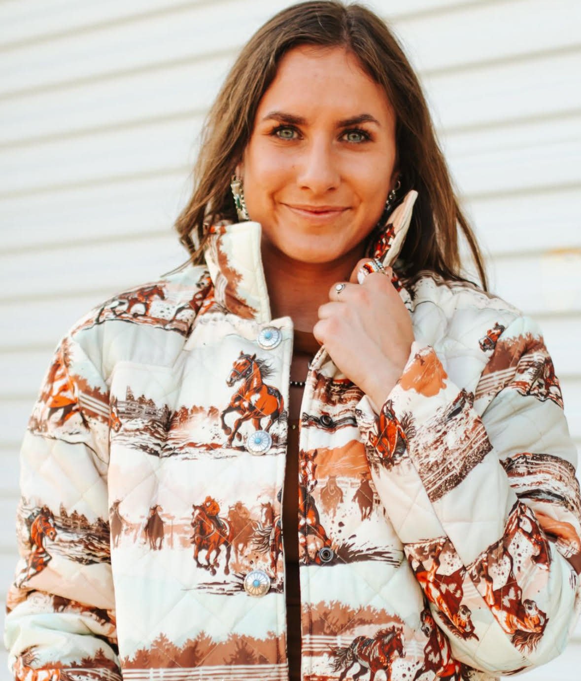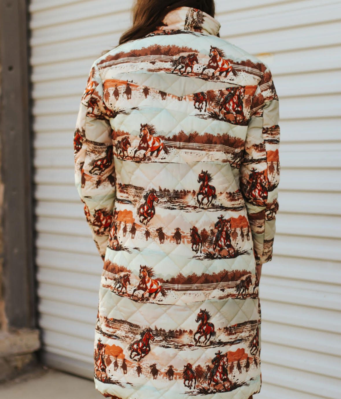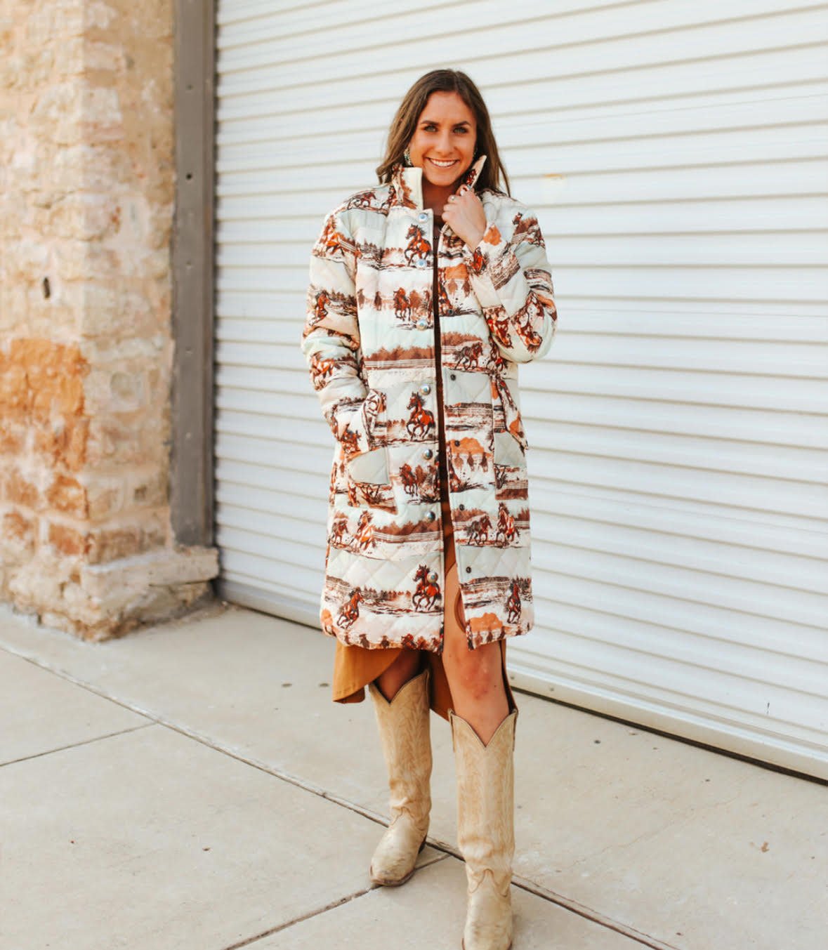 Designed to turn heads while keeping you warm and comfortable. Featuring a beautifully detailed Southwestern-style print, this coat blends rustic charm with modern fashion for a truly standout look.