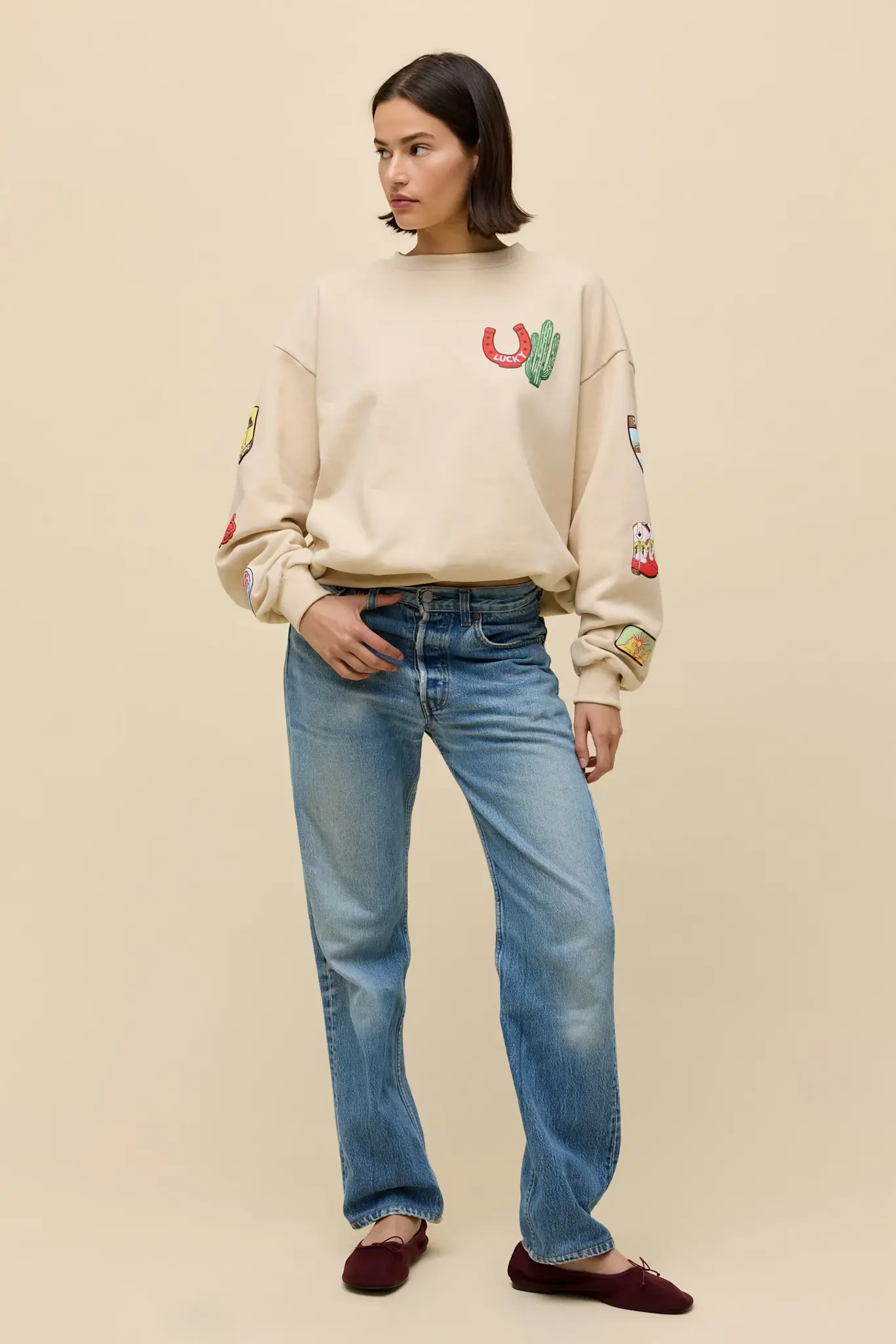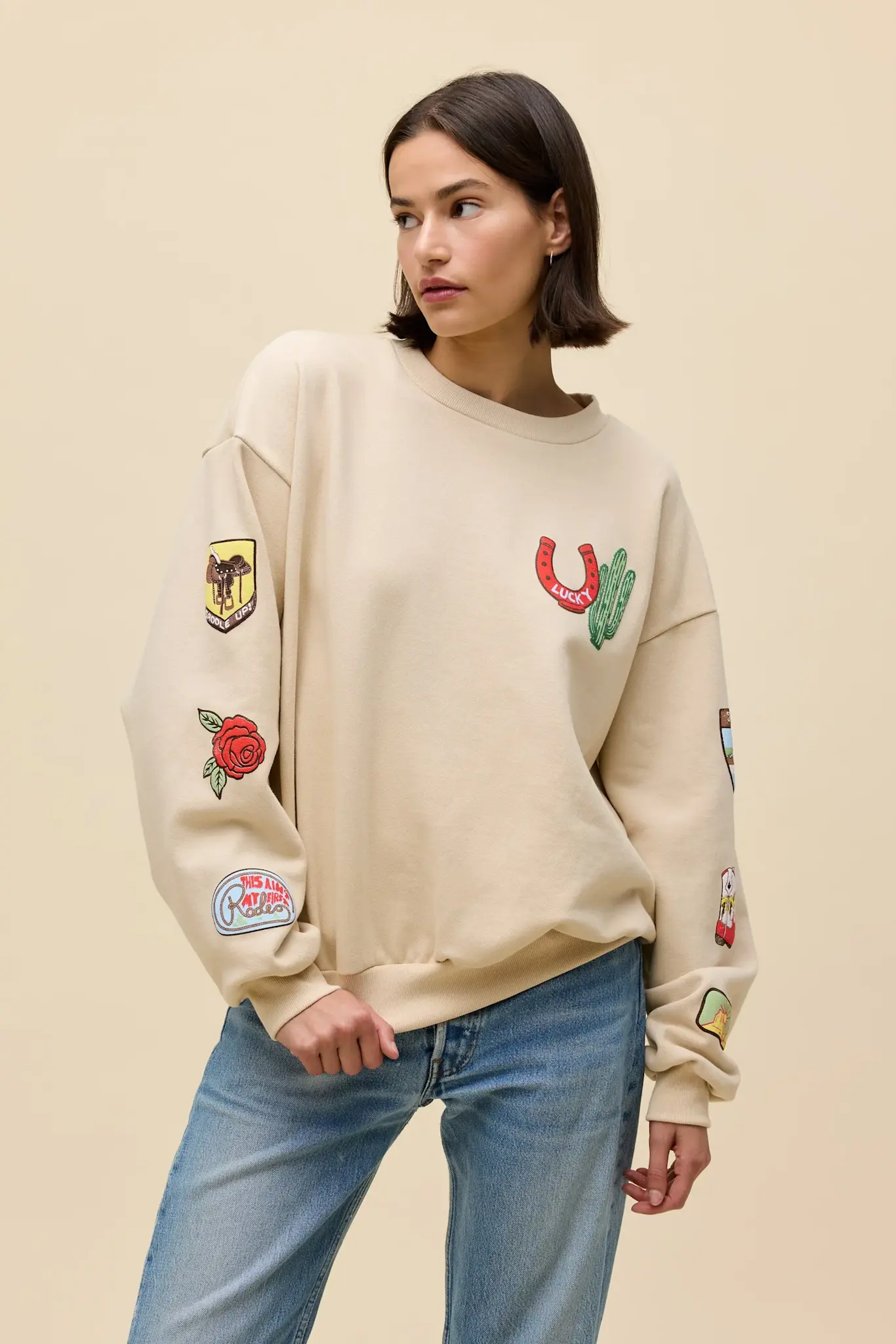 Western puff ink patches hit the left chest and both sleeves of this Oversized Crew Sweatshirt feeling like a cowgirl's collectible.