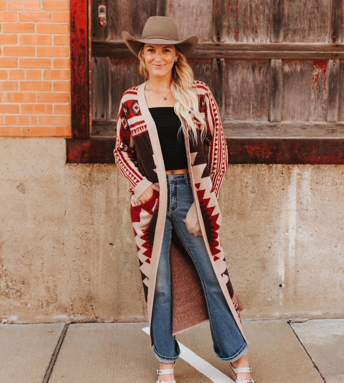 Wrap yourself in warmth and style with this striking southwestern-inspired duster cardigan!