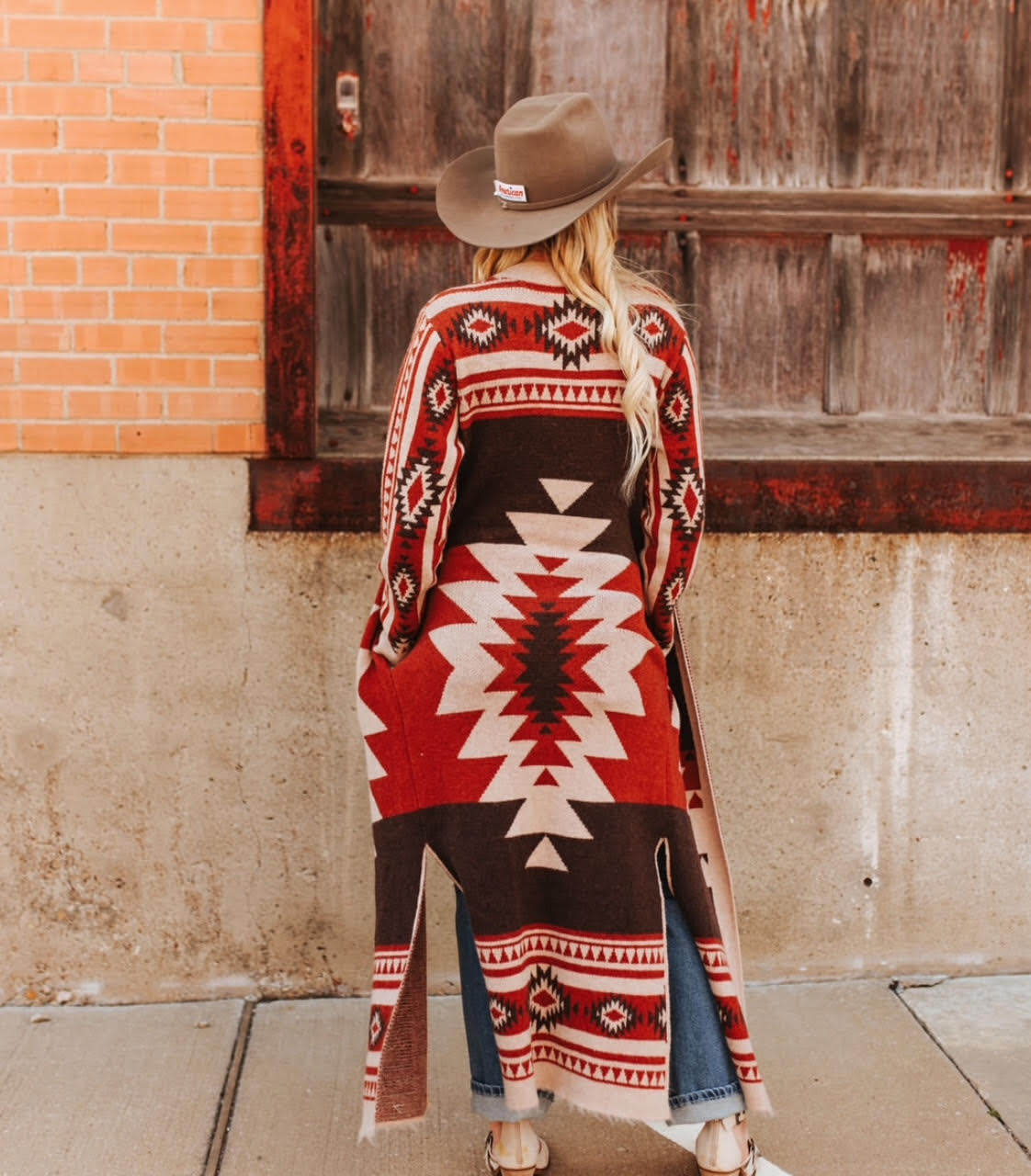 Featuring a bold geometric pattern in earthy tones of rust, ivory, and deep brown, this piece brings the spirit of the desert to your everyday wardrobe. Its relaxed, open-front design and longline cut make it the perfect layering staple — from fall bonfires to cool spring mornings.