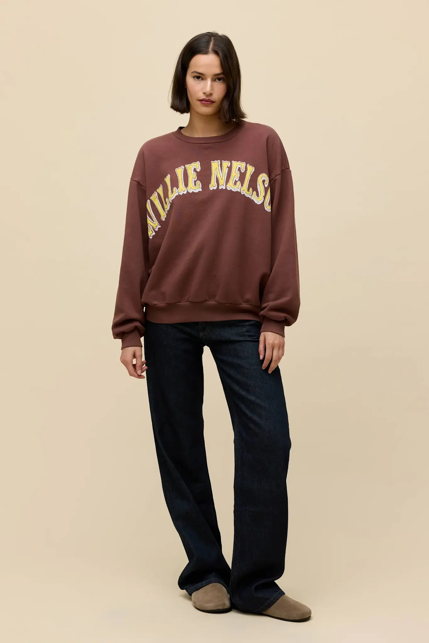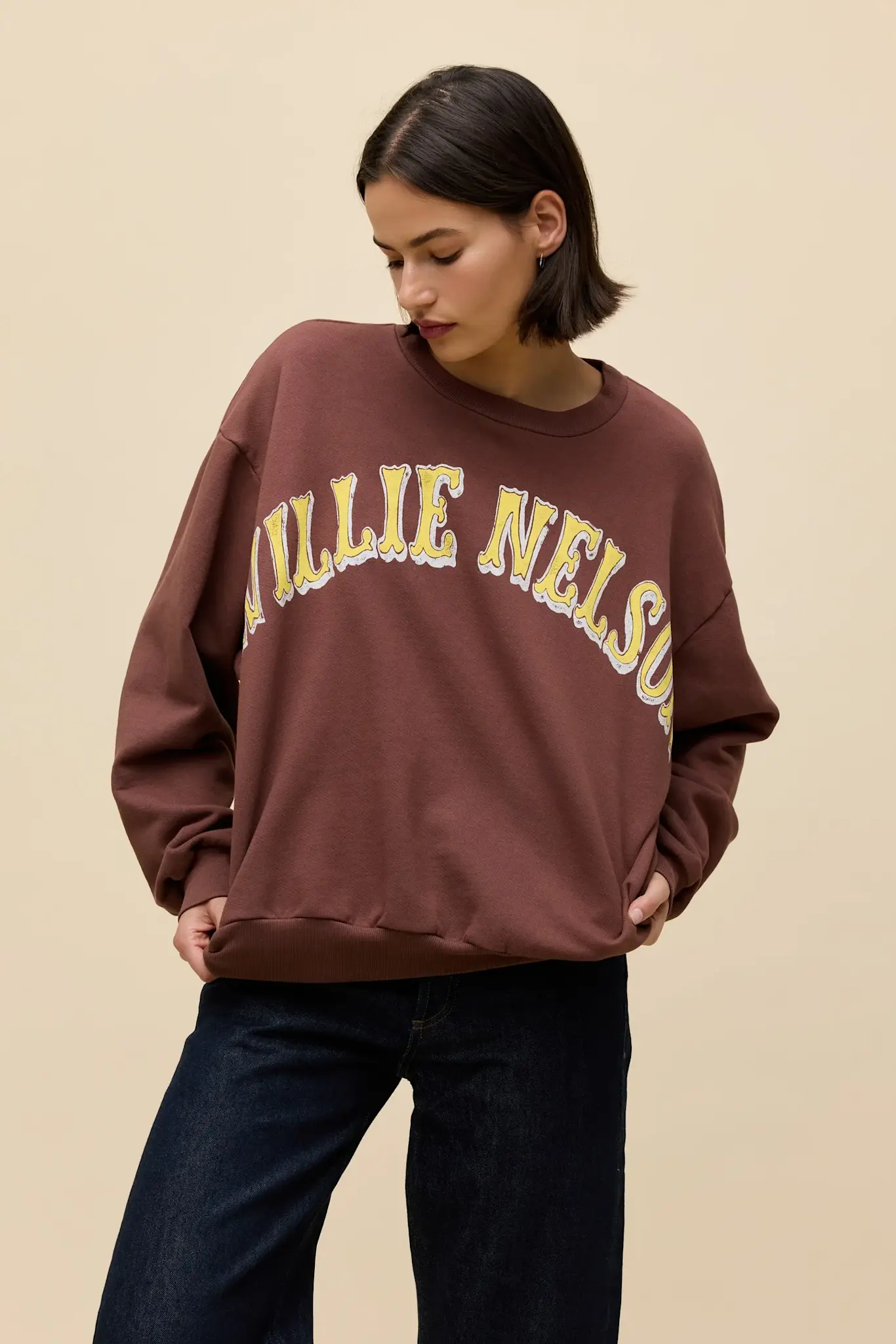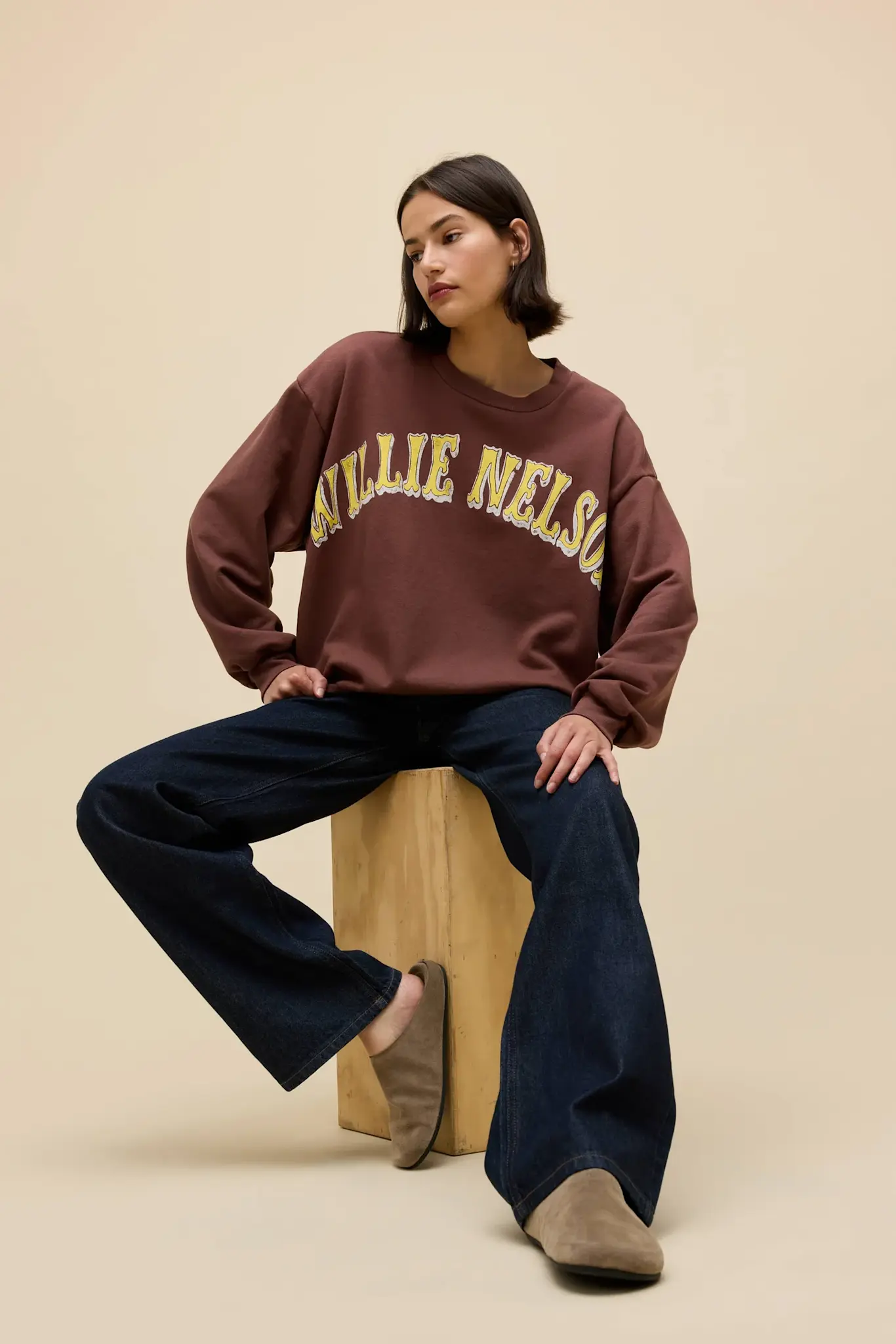 Willie Nelson lands center chest across this Oversized Crew Sweatshirt stamped with the time and place the the star's iconic track "On the Road Again" was performed live in Austin.