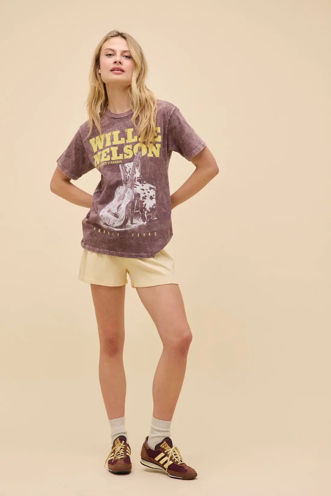 Hits this acid wash Weekend Tee shouting out his breakthrough album, Red Headed Stranger. Featuring Nelson's tool of the trade he named Trigger, a guitar graphic hits center chest with cow hide to accent this double-sided souvenir.