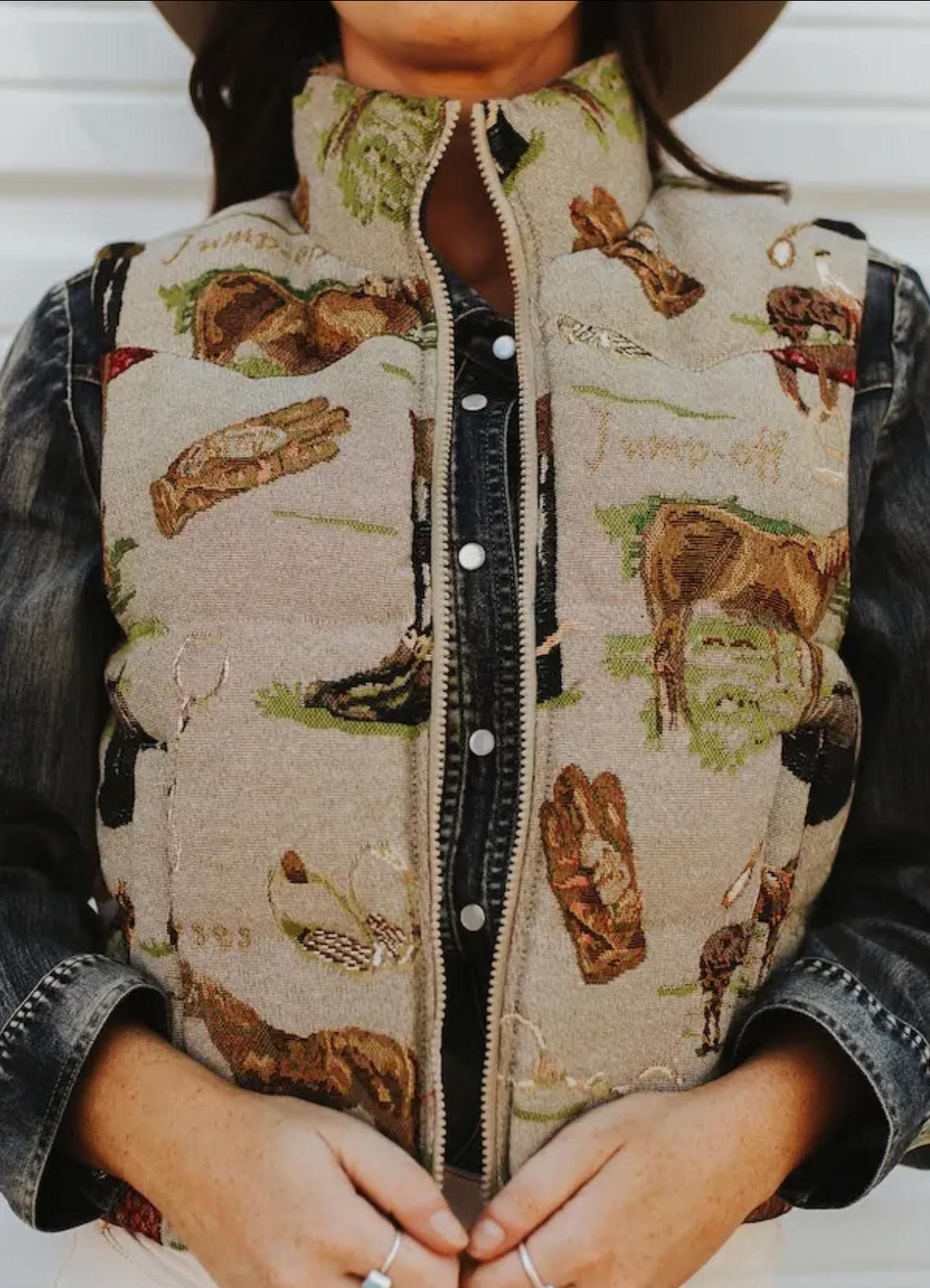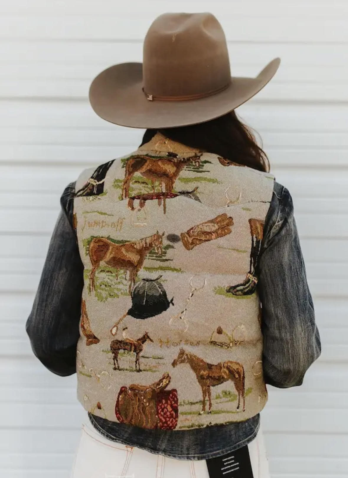 This vest showcases detailed vintage-style illustrations inspired by ranch life!