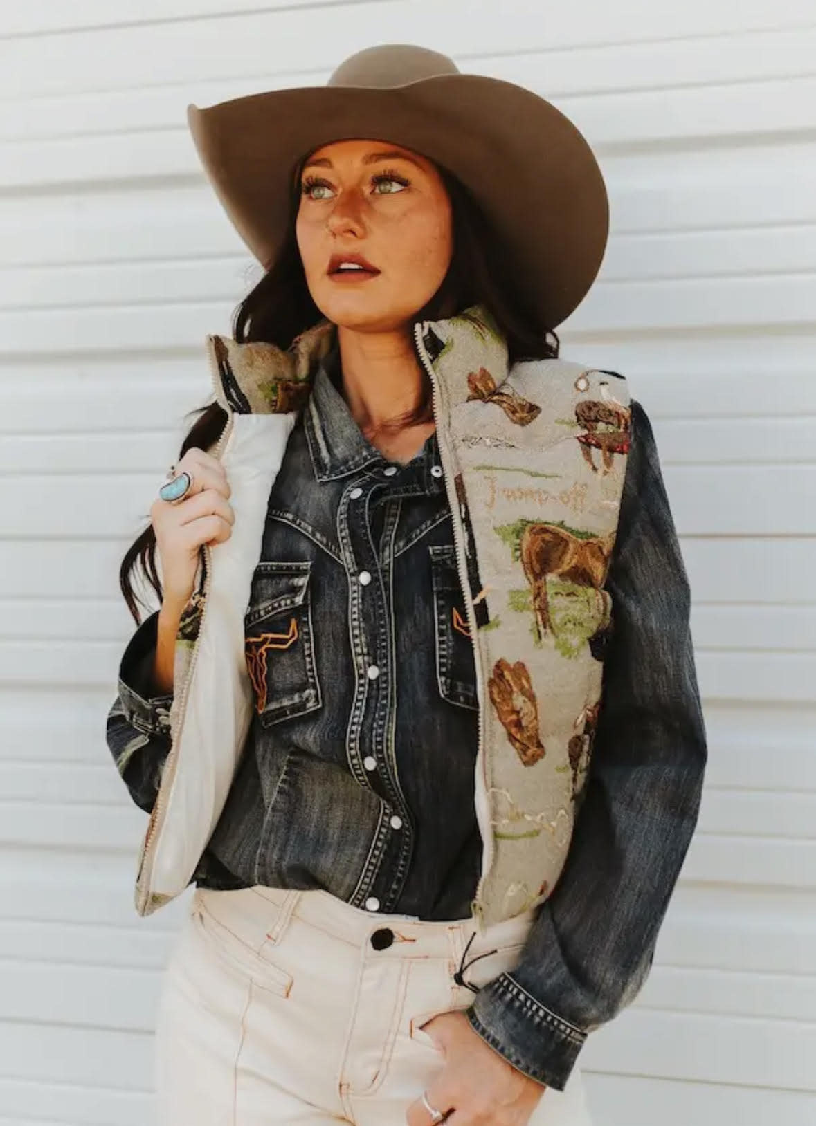 Complete with horses, gloves, and classic outdoor motifs. The quilted construction adds subtle warmth without bulk, making it ideal for layering through changing seasons. A sturdy full-front zipper ensures easy wear, while the puffer vest fit flatters your shape and adds structure to any outfit. Whether you're heading to the rodeo, dressing up for a night out, or simply adding personality to everyday denim, this vest delivers standout style with a rustic, artisanal touch.
