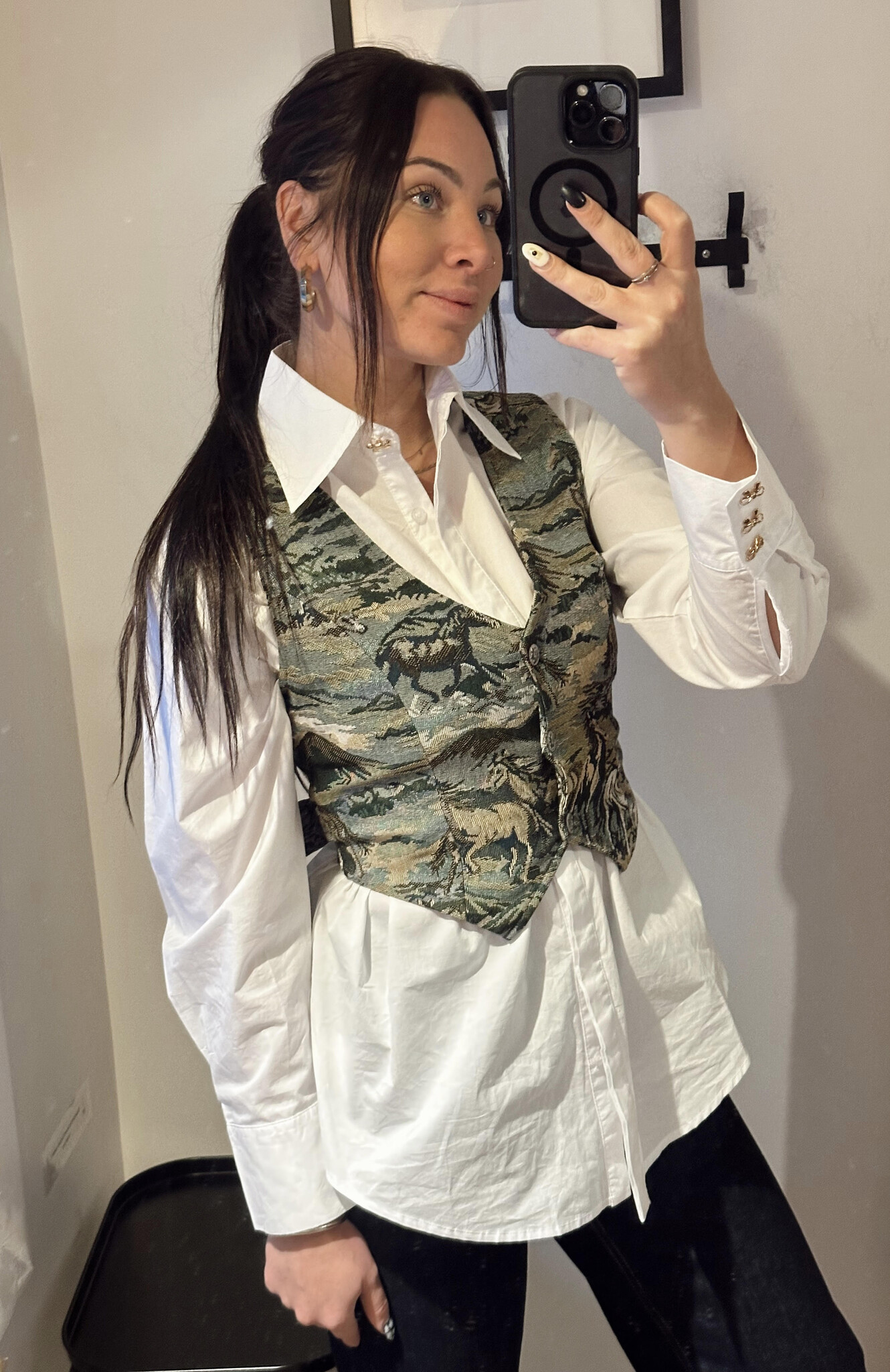 Made from woven tapestry fabric, this vest features a detailed landscape design with horse elements that give it a rich, vintage-inspired character. The cropped silhouette and pointed hemline enhance your waist, while the V-neckline creates a flattering, feminine shape.