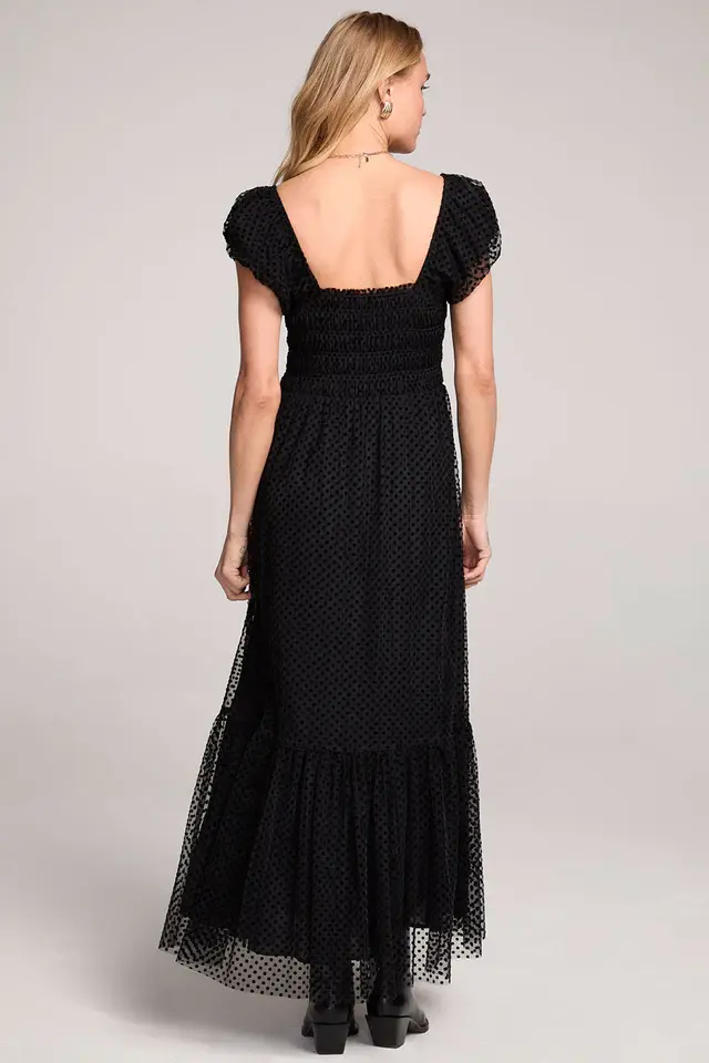 The gathered bodice and tiered body lend textural intrigue. Petite black polka dots pop against the soft cream fabric.